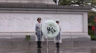 国旗护卫队迈着坚定整齐的步伐,向烈士墓碑敬献花圈。全体师生面向纪念碑深深鞠躬、默哀一分钟,以最庄重的礼节,寄托对革命先辈的无限哀思。