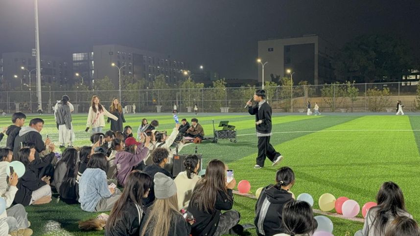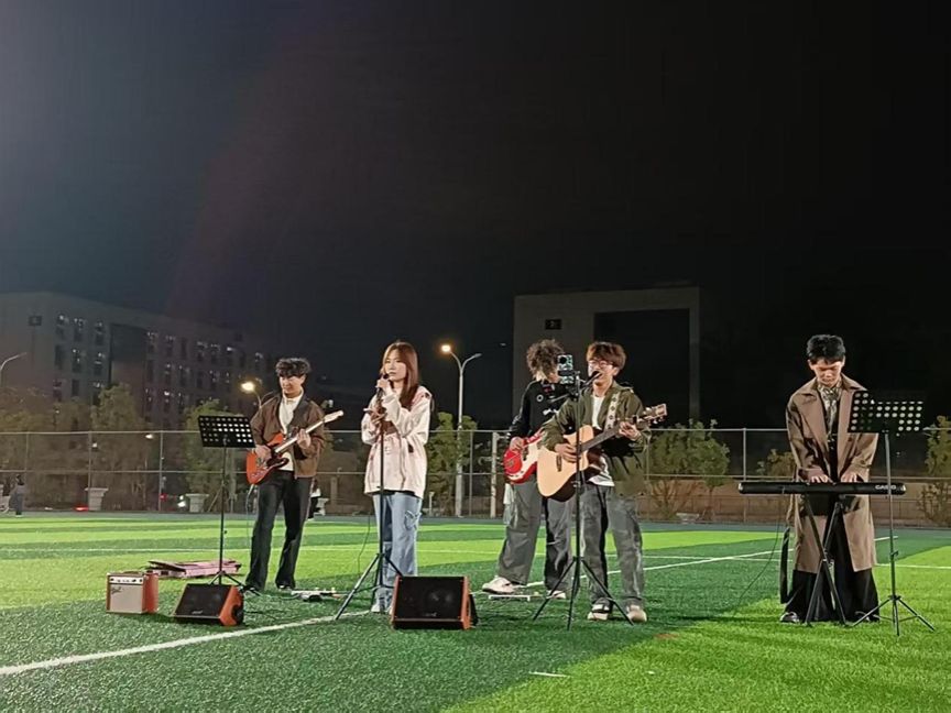 11月14日,操场中央草坪化身为青春舞台,“乐动青春 音你而来”主题草坪音乐节活力开场。25级新生“半成品宣言乐队”以《带我去找夜生活》点燃全场热情,电吉他与鼓点交相辉映,荧光棒舞动如星河。