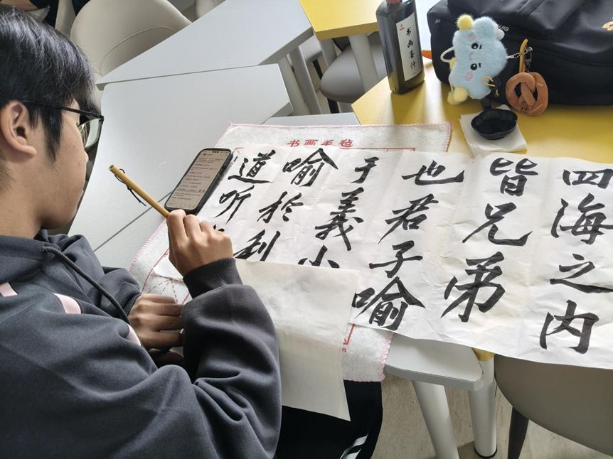指导教师占颖鹏引领参与者习练大自然太极拳,自“气沉丹田”至“云手开步”,于一招一式间体悟“天人合一”之静谧与力量。书画社社长当场示范书写技法,参与者们挥毫泼墨,书写“仁义礼智信”“己所不欲,勿施于人”等经典语句,在笔墨流转中涵养心性。太极招式抢答、古诗找错等互动环节氛围热烈,获奖学生获赠积木、木制书签等精美奖品,于欢乐中增进对传统文化之理解,彰显年轻一代对传统文化之热爱与传承。