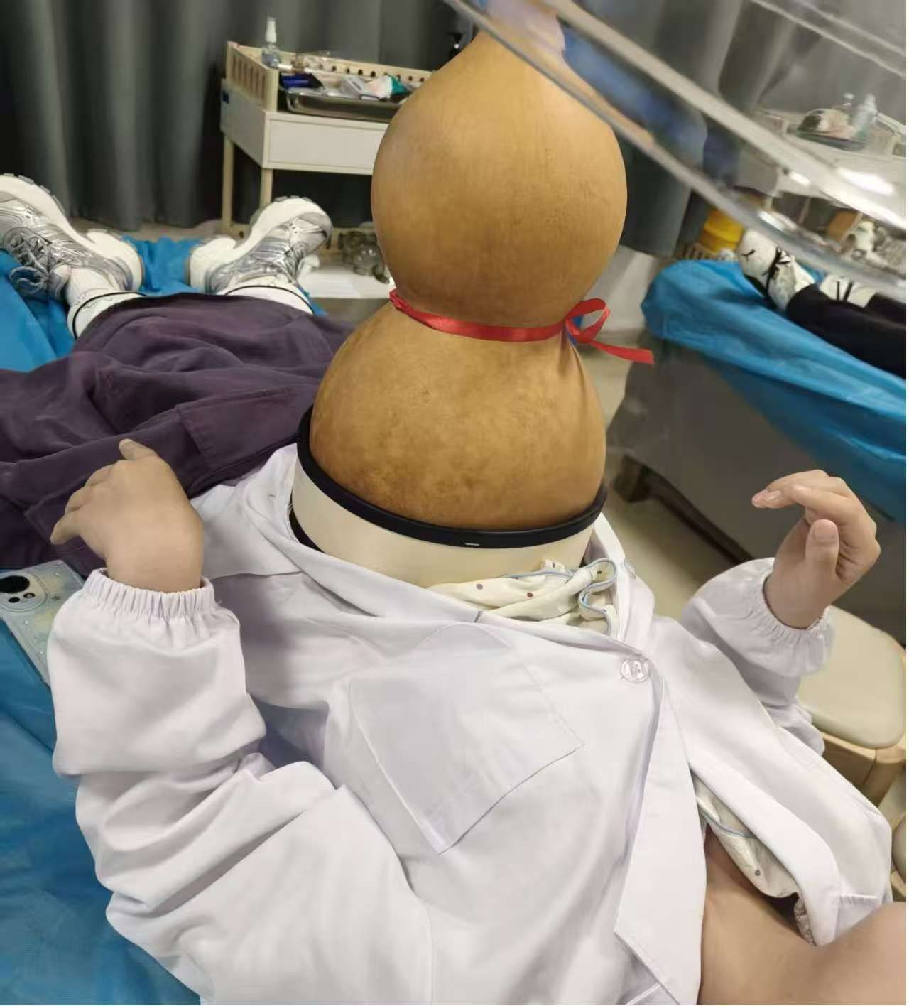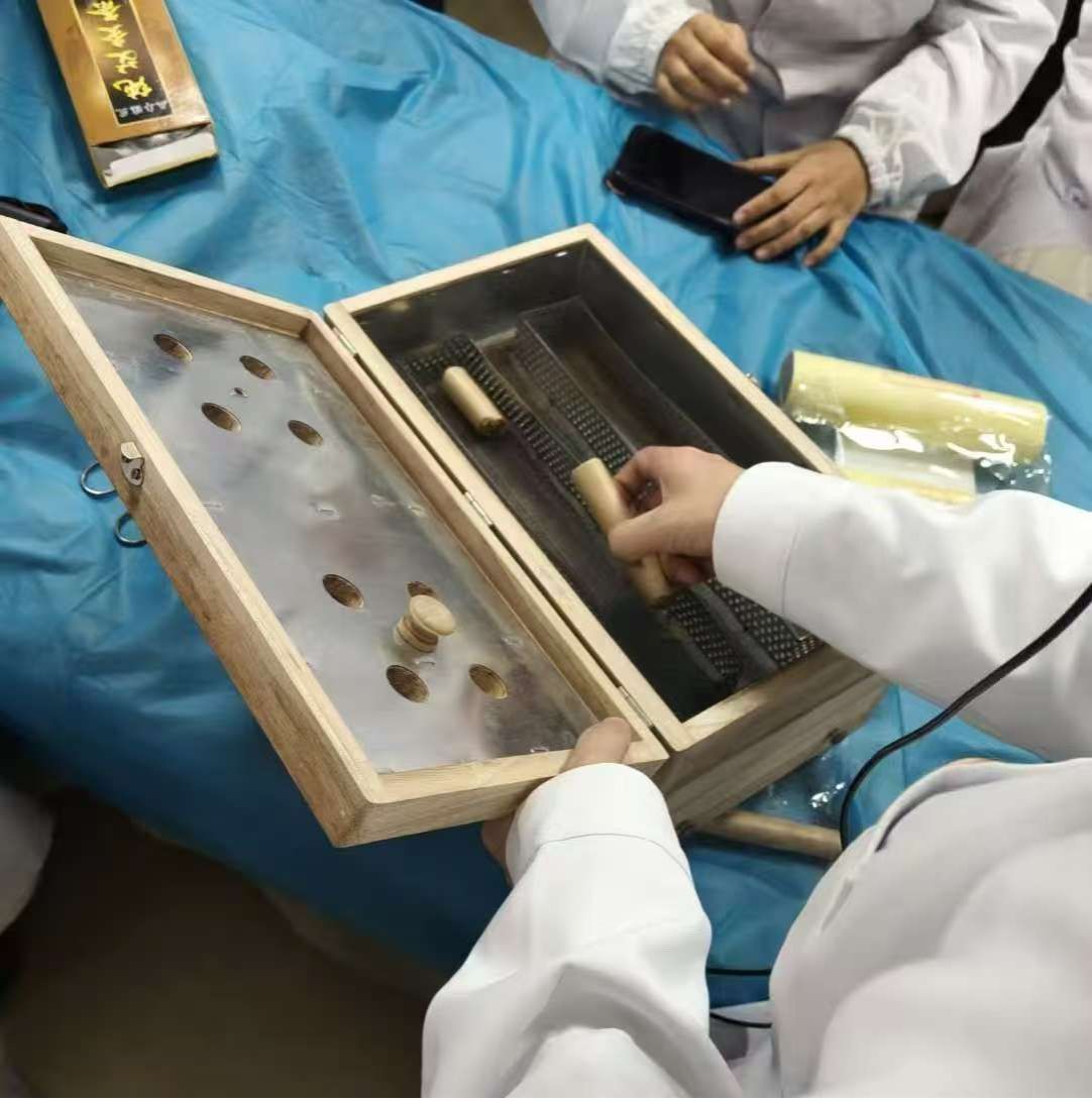 在艾灸器具展示环节中,葫芦灸、五针灸罐及各类艾灸盒等多种专业器具琳琅满目,教师从艾灸条点燃方法、灸具固定技巧、温度调节窍门,逐一进行手把手演示教学。学生们围坐观摩,通过拍摄视频、记录笔记等方式,精准捕捉关键操作步骤,同时重点学习腹部艾灸的体位摆放规范与皮肤防护要点,为实操练习做好充分准备。