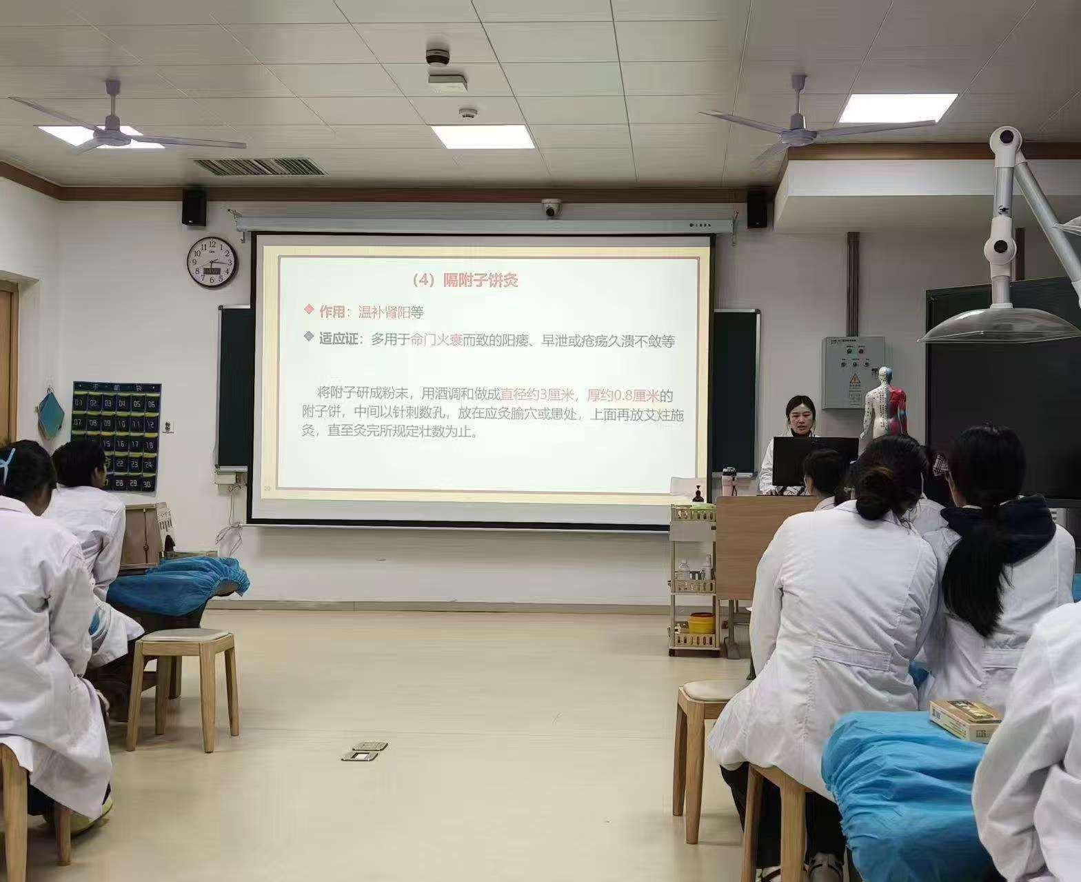 为保障操作安全,活动在专业实训室里开展,现场配备艾灸排烟系统、灭灸器、便携式灭火器等专业安全工具,全程遵循标准化操作流程,让学生在安全可控的环境中积累实操经验,逐步提升操作熟练度与规范性。
