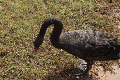 黑羽蓬松,红喙鲜艳,在岸边草地低头觅食,姿态优雅,动作轻柔且优雅,尽显黑天鹅的高贵气质。