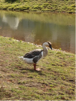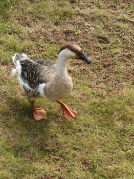 灰羽为主,黑白斑纹点缀,橙红喙脚鲜艳,喜欢在平静的水面缓缓游弋,偶尔停下梳理羽毛,对周围环境充满好奇但警惕性高,一旦有动静就会抬头观察。