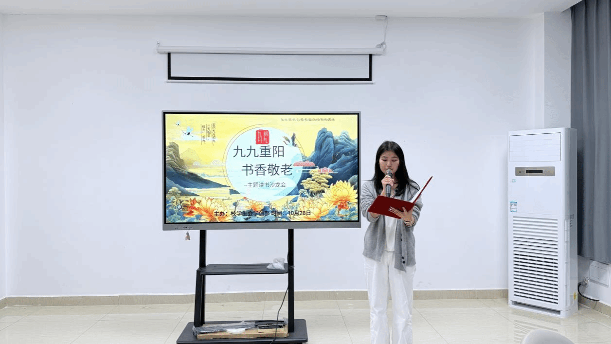 活动在温馨的氛围中拉开帷幕。主持人首先介绍了重阳节的文化渊源与时代意义,为整场活动奠定了庄重而温暖的基调。在“经典朗读会”环节,同学们声情并茂地诵读了《背影》等经典名篇,并围绕“由文字想起的人”与“当代之孝”等议题展开了热烈讨论。同学们或分享自带书籍中的感人片段,或结合自身经历畅谈对亲情的感悟,在思想的碰撞中深化了对孝道文化的理解。