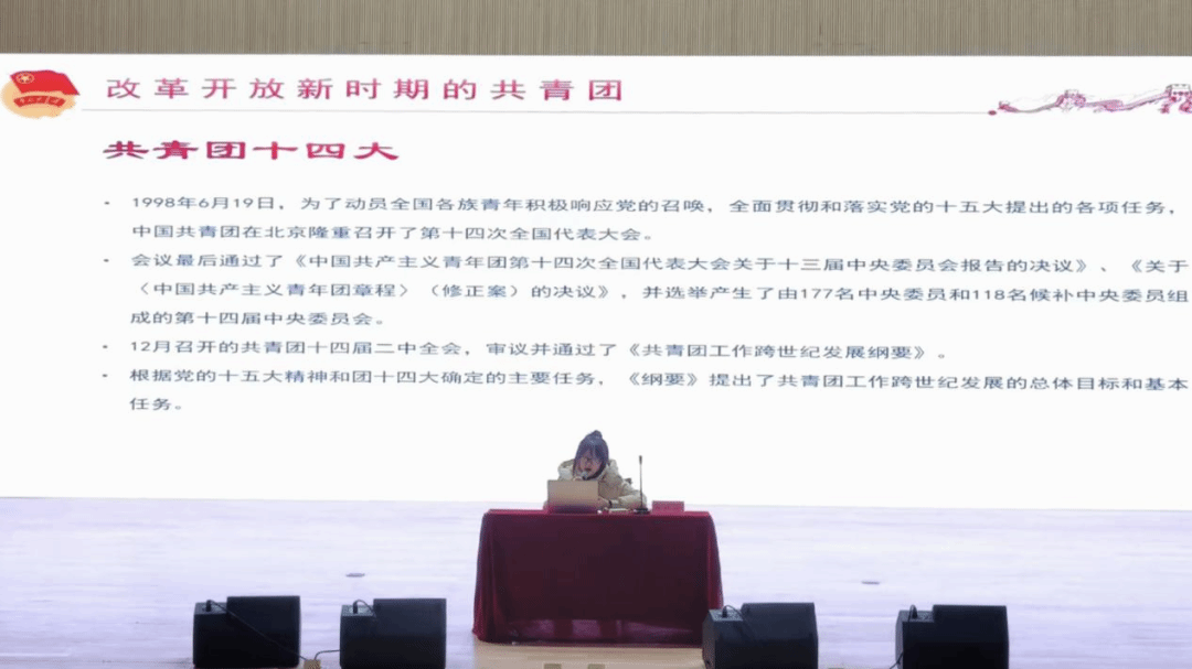 校团委宣传委员徐佩瑶以“光辉历程,青春使命”为主题,系统梳理共青团百年奋斗历程,将团史融入党领导下的革命、建设与改革宏大叙事中。课程联系当代青年服务国家战略的生动实践,阐释“青春使命”的时代内涵,激励学员从历史中汲取力量,把个人理想融入国家发展大局。
