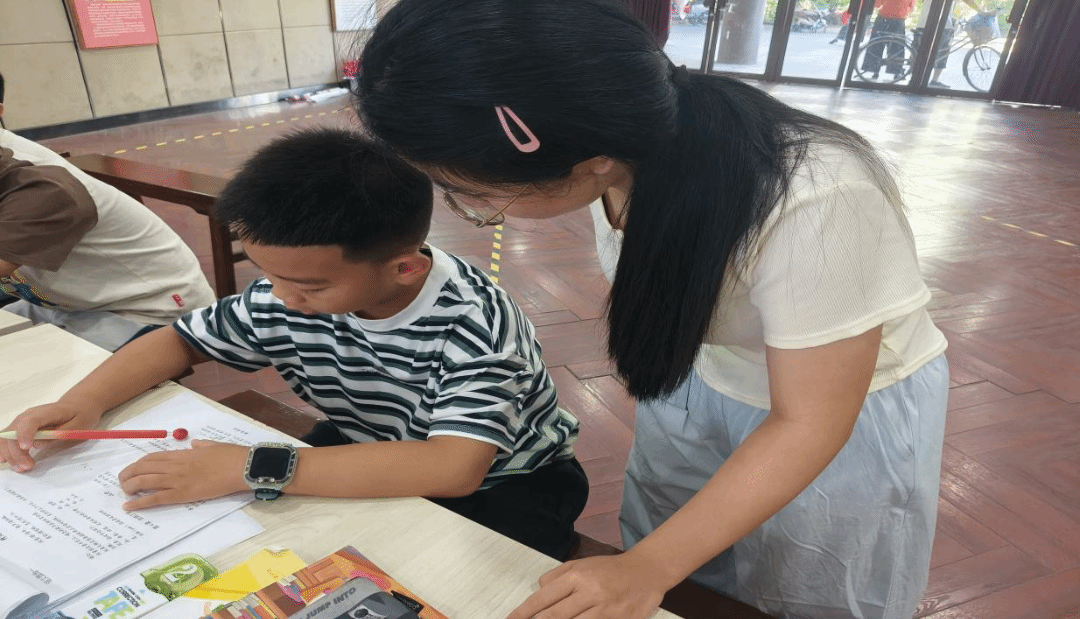 协助暑期托管,是与童真世界的温暖碰撞。 职工之家的托管班聚集了不少孩子,我的任务是辅导作业、照看课间活动。起初面对一群精力旺盛的“小机灵”,我常因他们天马行空的问题手忙脚乱,但渐渐在耐心陪伴中找到节奏。无论是帮低年级孩子区分易混字母,还是引导爱打闹的男孩专注学习,看着他们作业本上的红勾增多,听着放学时“明天见”的招呼,我懂得了陪伴的耐心藏着珍贵的反馈。