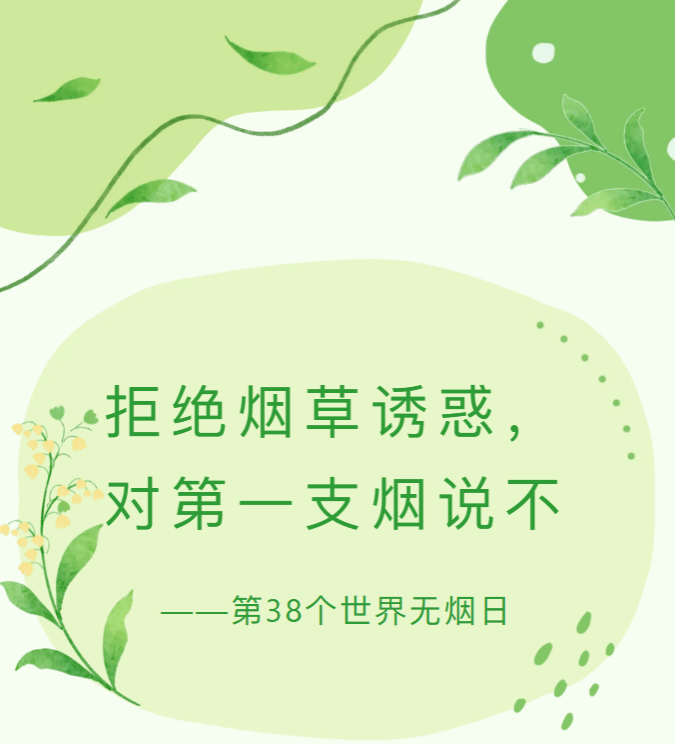 2025年5月31日是第38个世界无烟日,今年活动主题为“拒绝烟草诱惑,对第一支烟说不”。世界无烟日活动旨在扎实推动健康中国控烟专项行动,广泛开展控烟宣传教育,在全社会营造支持控烟、参与控烟的良好氛围,特别是引导青少年养成不吸烟的良好习惯。
