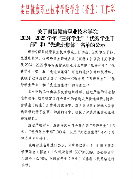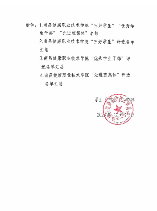 上一条:关于南昌市卫生学校2024—2025学年“三好学生”“优秀学生干部”“文明学生”和“先进班集体”名单的公示 下一条:关于康养系“羽”动青春,共筑康养羽毛球比赛学生名单公示