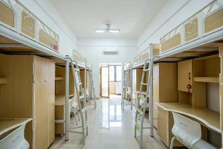 宿舍周边设有运动场地,宿舍生活设施齐全均配有风扇、空调、独立卫生间、饮水机、吹风机、洗衣房等,所有宿舍均为6人间。自备生活用品和床上用品,宿舍床尺寸:195cm×90cm。