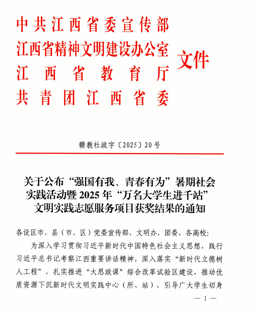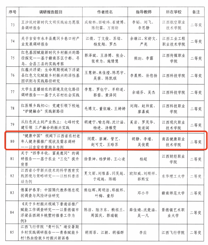 在 “强国有我、青春有为” 暑期社会实践活动中,我校调研报告《农村老年人健身操推广现状及需求调研 —— 以吉安市黄坳乡为例》,凭借扎实的调研内容与鲜明的实践价值,荣获二等奖。