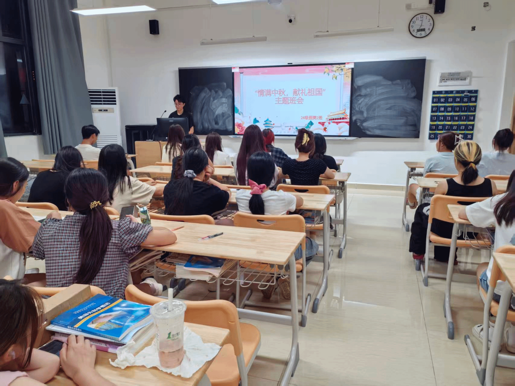 2024级医美2班举办“情满中秋,献礼祖国”主题班会。同学们围坐交流,分享家乡中秋习俗与故事,在温馨互动中感受传统文化的深厚底蕴。伴随熟悉的爱国旋律响起,全体同学齐声高歌,以青春之声表达对祖国的热爱与祝福。整场活动既洋溢着团聚的温暖,也涌动着真挚的爱国情怀。