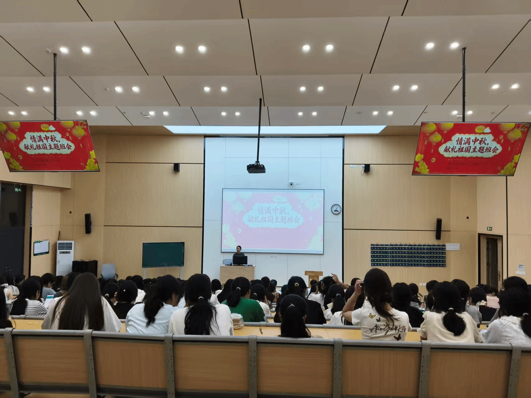 梅殷珑由节日文化延伸至家国情怀,指出“大国复兴是个人梦想的舞台”,鼓励同学们将个人成长融入时代发展大局。她通过赏析经典诗词,引导大家体会其中蕴含的报国志向与思乡情感,并强调在双节交融的背景下,更应树立远大理想,以实际行动贡献青春力量。