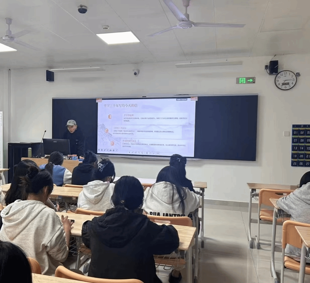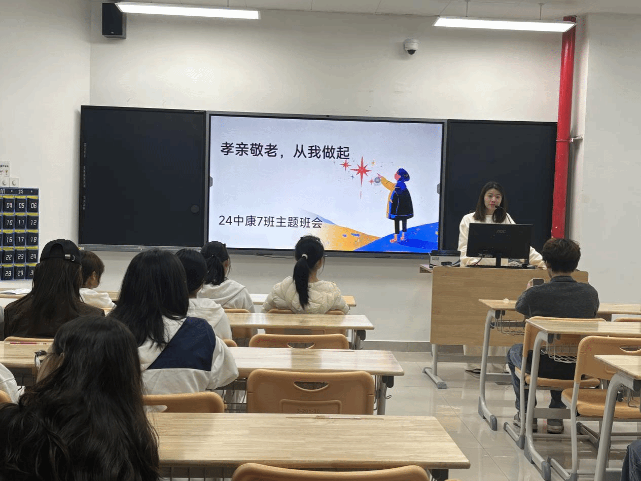 2024级中康7班辅导员万敏通过历史典故与身边事例,生动阐释“孝”不仅是物质赡养,更包含精神陪伴与情感尊重,引导同学们深入理解其内涵。