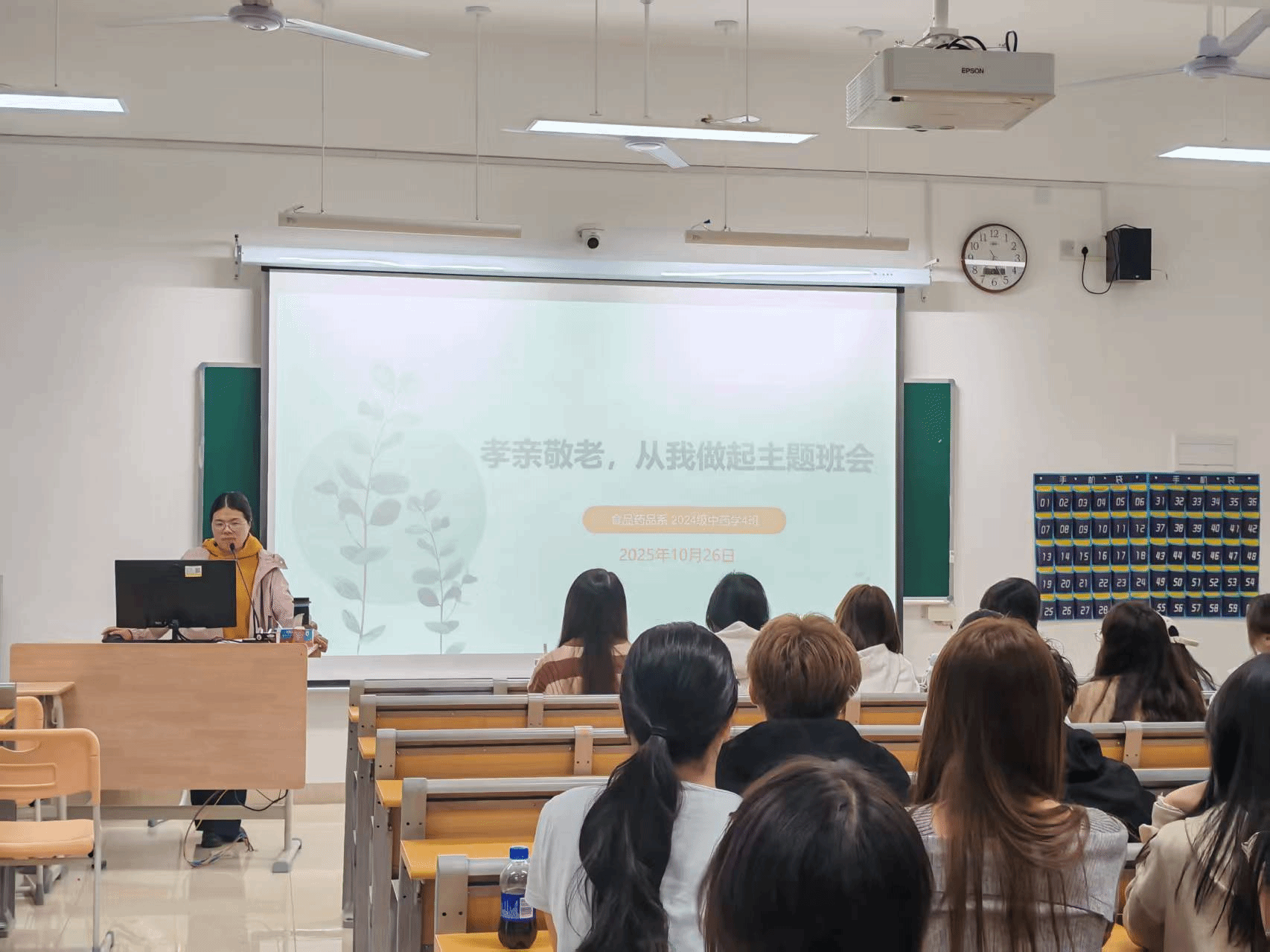 2024级中药学4班组织开展了“孝亲敬老,从我做起”与“校园交通安全教育”双主题班会。辅导员杜娟围绕“孝亲敬老”主题,从内涵理解、实践路径到典型案例,引导学生从日常小事践行孝道,鼓励参与敬老院志愿服务,在实际行动中培养社会责任。班会同时开展校园交通安全教育,杜娟重点提醒学生上下课期间避免低头使用手机,自觉行走人行道,增强自我保护意识,确保校园出行安全。