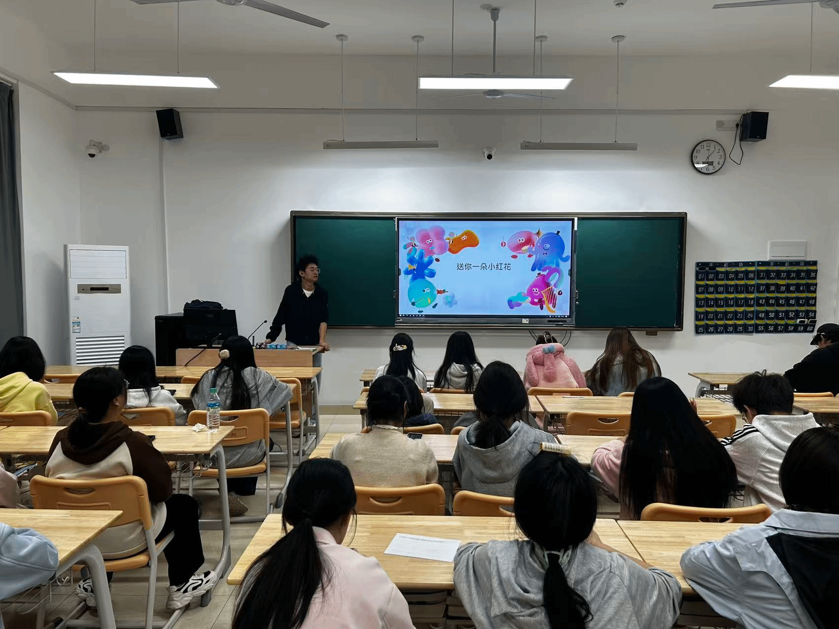 随后的“小红花传递”环节将气氛推向高潮。每位同学在卡片上写下感谢对象及缘由,并将纸质小红花亲手送出。有的同学向平日里默默付出的班干部表达感谢,有的同学向耐心解答问题的同桌传递心意,还有同学特意将小红花送给辅导员,感谢其日常的关怀与指引。接过小红花的瞬间,现场掌声与笑声交织,温暖在传递中持续蔓延。陈玉玫在总结中指出,感恩不应仅限于特定时刻,更应融入日常言行。一句真诚的“谢谢”、一次主动的帮助,都是温暖的传递。她希望同学们常怀发现美的眼睛,以行动回馈善意,在互助中共同成长。
