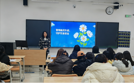 2024级口技7班辅导员王凤景老师通过PPT展示,向同学们讲解了“幽灵外卖”的特征与辨别方法,并结合学生日常外卖消费习惯,建议大家优先选择学校食堂就餐,条件允许时可到实体门店用餐,强调养成健康饮食方式、爱护身体的重要性。