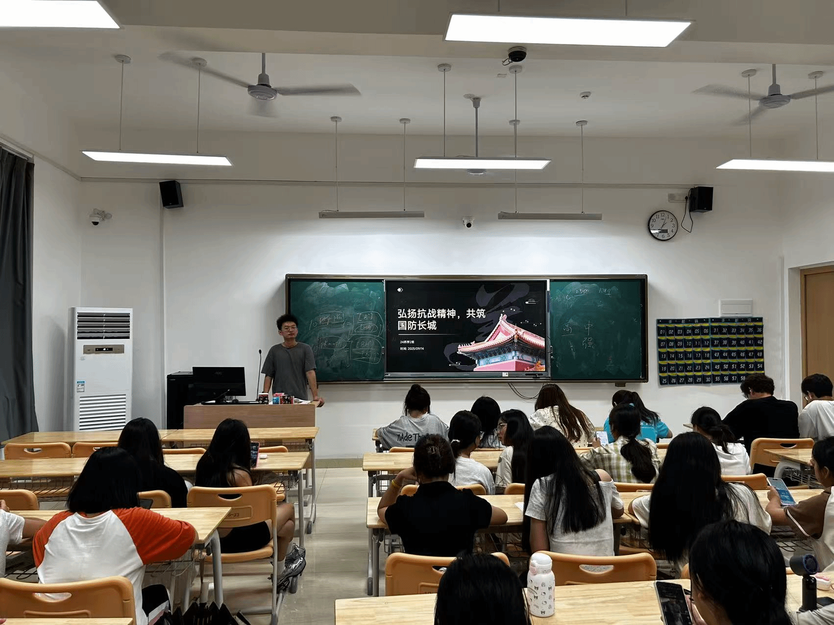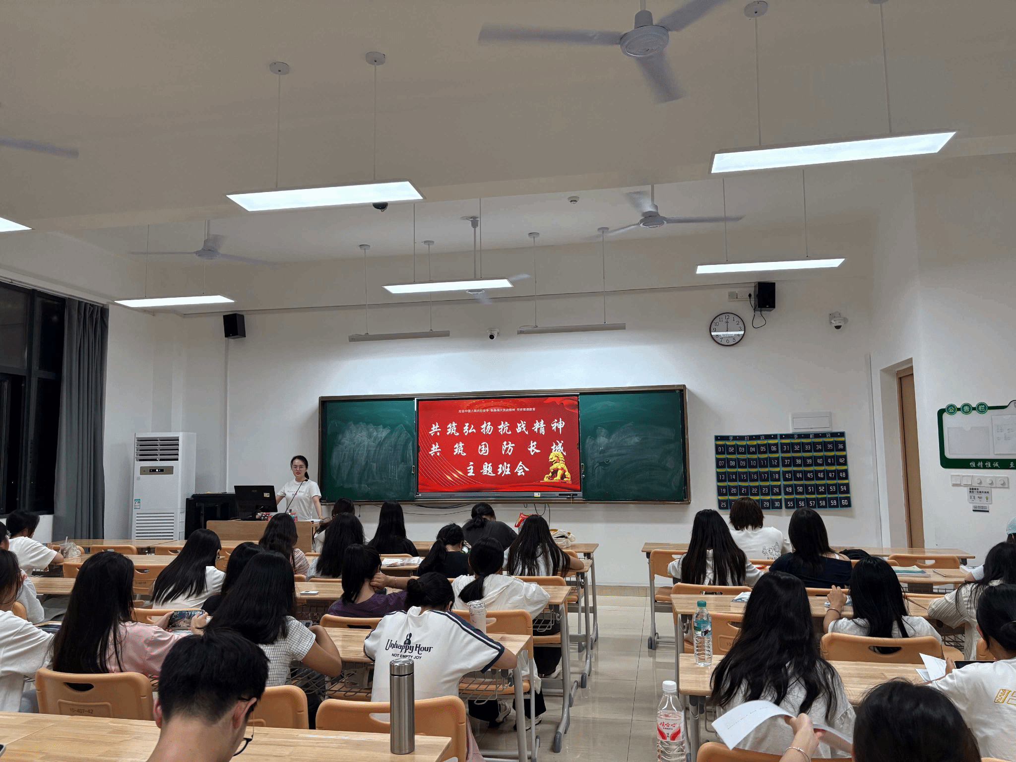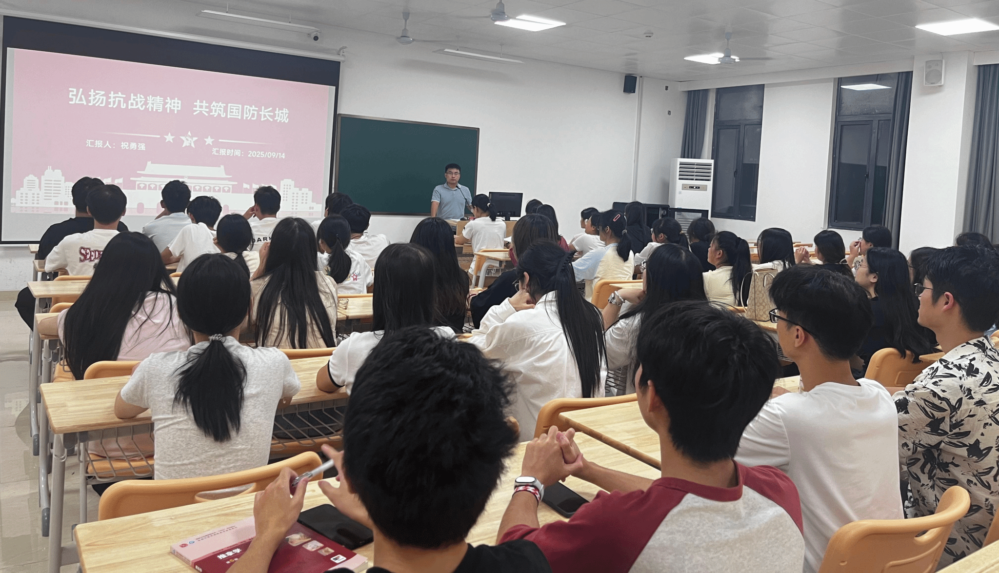 为进一步增强学生的国防观念和爱国意识,各系利用周末晚点名于2025年9月14日举办“弘扬抗战精神 共筑国防长城”主题班会。
