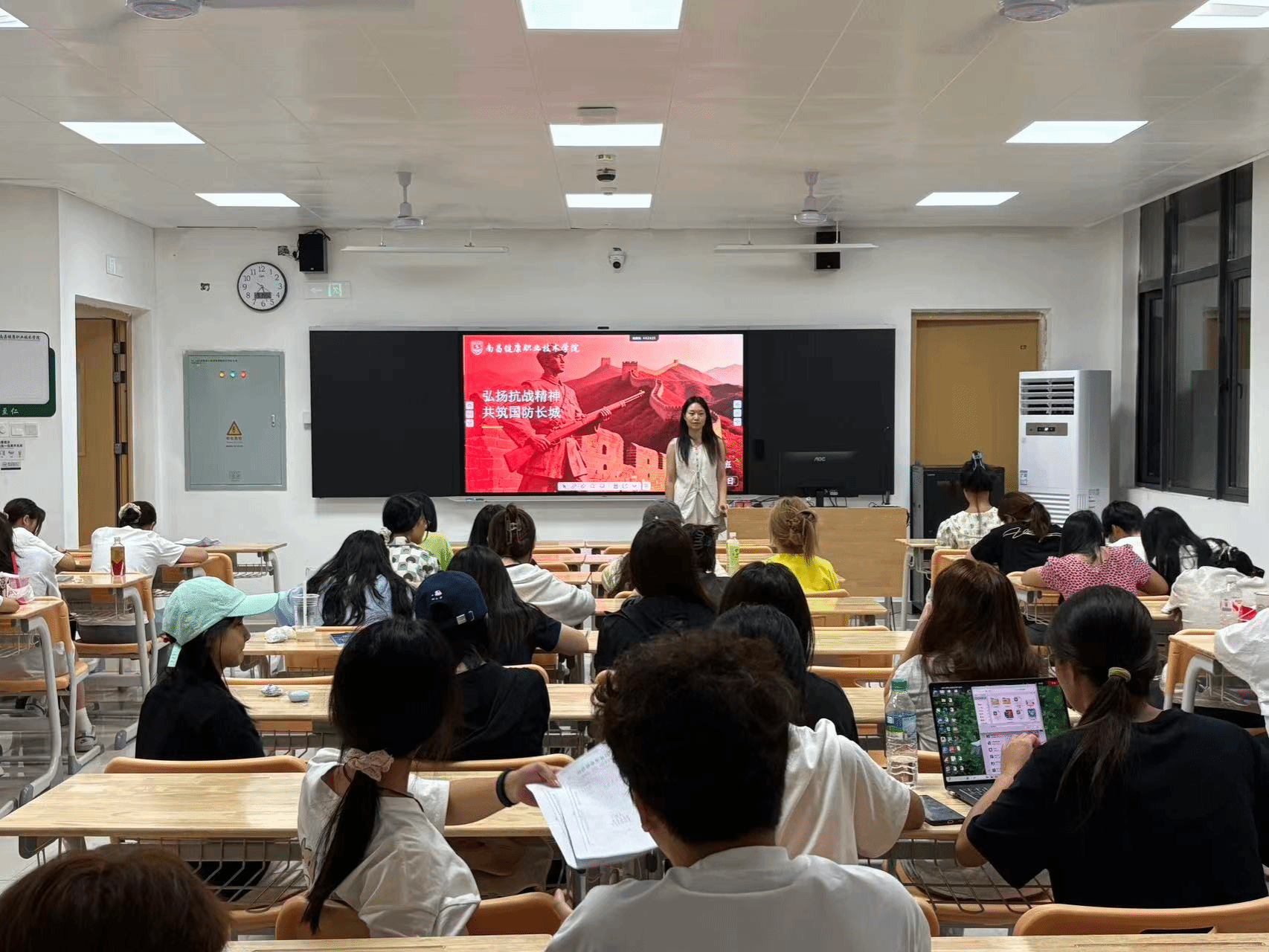 2024级药学4班辅导员廖伊琦开展了“弘扬抗战精神,共筑国防长城”主题班会。班会上,老照片里的烽火岁月和纪录片中的国防发展,让红色记忆愈发清晰。同学们从“平型关大捷”的奋勇突围谈到新时代国防科技的飞速发展,从“抗战精神的时代内涵”聊到“高职生的国防担当”,字字句句都充满了青年的热血与担当。
