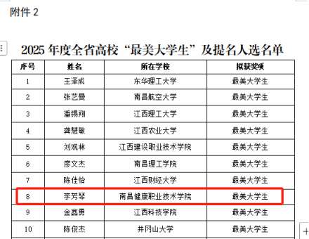 近日,江西省教育厅公布了2025年度全省高校“最美辅导员”“最美大学生”推选活动结果。我校康养系2024级中康2班李芳琴同学,经过层层选拔,在推选活动中脱颖而出,荣获2025年度全省高校“最美大学生”!