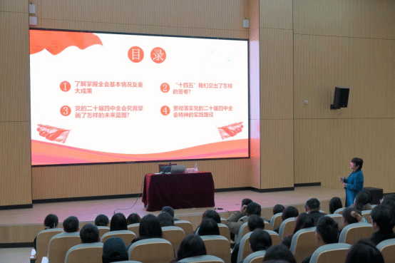 宣讲会上,卢涛以清晰的逻辑、详实的内容,全面解读党的二十届四中全会精神。包括2025年10月20日至23日在北京召开的会议背景、参会人员构成以及核心议程等,重点强调全会审议通过的《中共中央关于制定国民经济和社会发展第十五个五年规划的建议》作为纲领性文件的重大意义,系统解读了该文件三大板块、15个部分、61条的整体框架与核心要义,让在场师生对全会精神有了全面系统的认知。