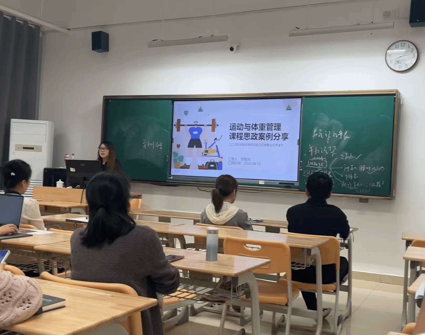 此外,罗雅琪老师围绕“运动与体重管理课程思政案例”进行了专题分享。她结合该课程的专业特点,选取了贴合学生生活实际、贴合健身指导与管理专业人才培养目标的思政案例,详细讲解了如何将健康理念、责任担当、科学素养等思政元素有机融入课程教学全过程,分享了案例设计思路、课堂实施方法以及教学效果反馈,为各位教师开展课程思政教学提供了鲜活的参考范例,进一步推动全系课程思政教学质量的提升。