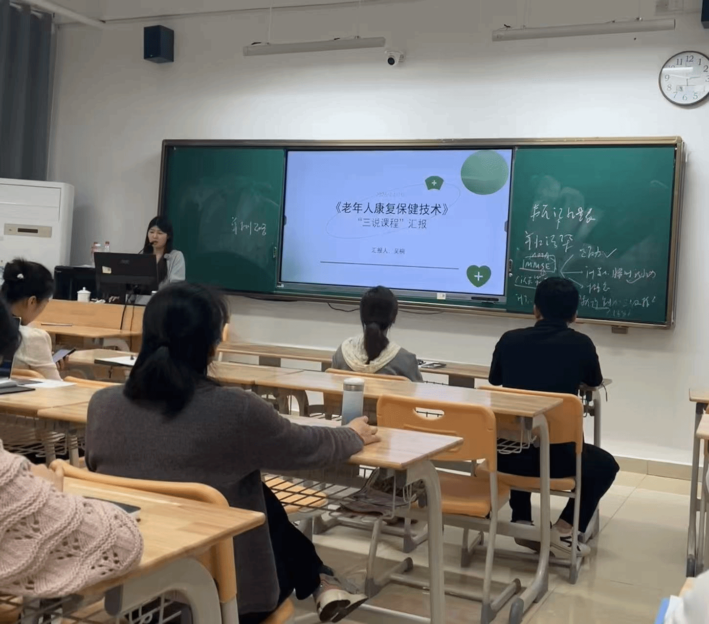 随后,吴桐老师围绕“老年人康复保健技术”课程开展说课分享。她结合康养专业人才培养要求和老年人康复保健的岗位需求,从课程定位、教学目标、教学内容、教学方法、学情分析、教学评价及思政元素融入等方面,系统阐述了课程的说课思路。重点讲解了如何结合老年人常见健康问题,优化教学内容、创新教学模式,让学生扎实掌握老年人康复保健的核心技术与实操技能,同时分享了自身在说课准备、课程设计中的经验与思考,为各位教师优化说课流程、提升课程教学质量提供了有益借鉴。