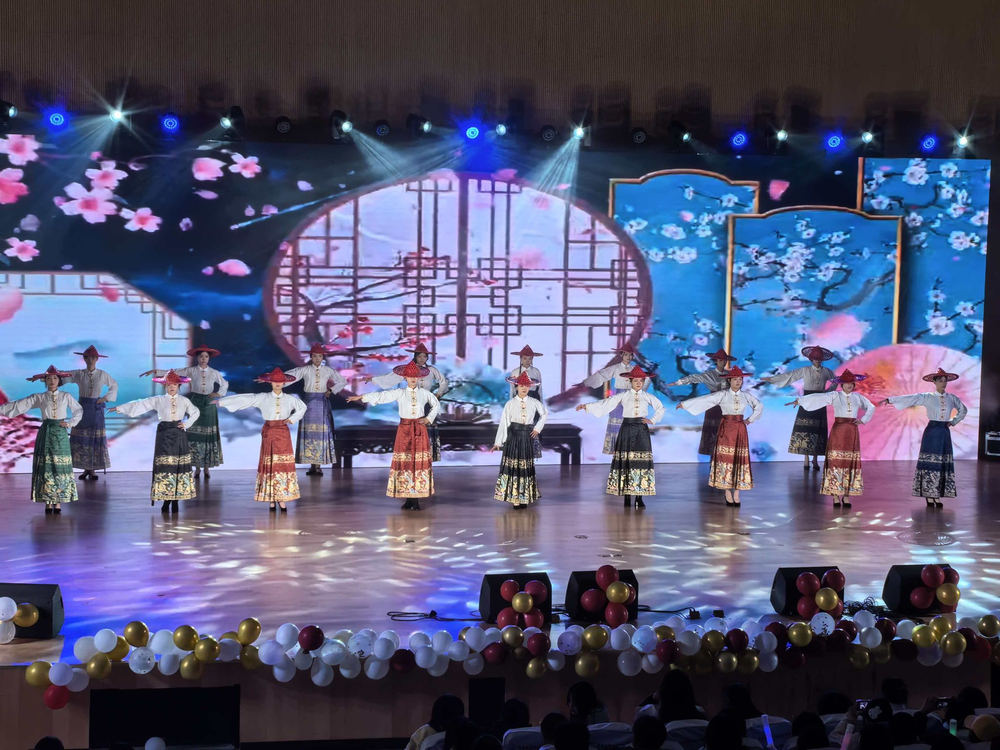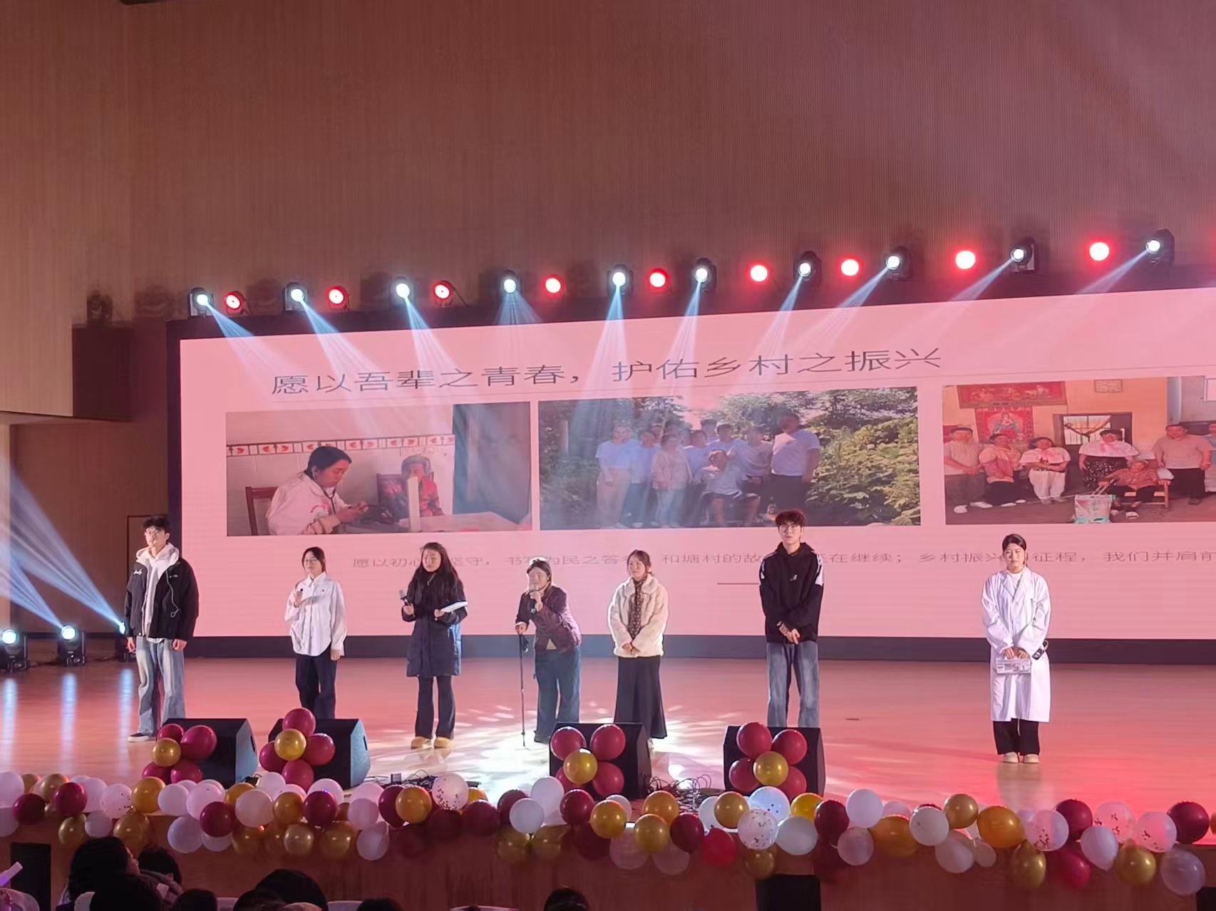 第二篇章“万象飞扬·砥砺前行”聚焦系部特色与责任担当。小品《用药乌龙》以诙谐幽默的方式普及用药安全知识,让师生在欢声笑语中收获实用技能;运动秀《羽翼飞扬》展现了师生蓬勃的运动活力,传递健康生活理念;文艺串烧《民族风采》融合多元民族文化元素,舞姿优美、歌声动人,彰显中华文化的包容性与多样性;歌舞串烧《青春旋律》用动感的节奏与青春的舞姿,演绎出当代大学生的朝气与活力。情景剧《和塘故事》成为本篇章的亮点,节目生动讲述了学校历任驻村工作队在进贤县下埠集镇和塘村从脱贫攻坚到乡村振兴的奋斗历程,再现了驻村工作队为村民办实事、谋福祉的暖心场景。节目最后,和塘村两委干部及驻村工作队历任第一书记、工作队员上台自我介绍,朴实的话语与真挚的情感赢得全场热烈掌声,让师生深刻感受到乡村振兴中的“健康力量”。随后的二等奖100名抽奖环节,持续为现场增添惊喜。