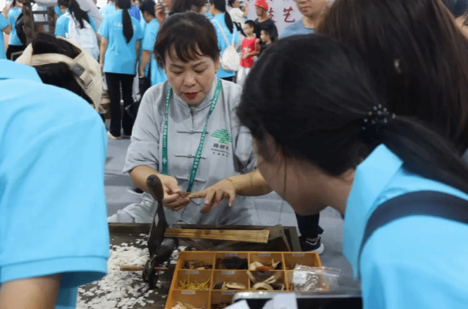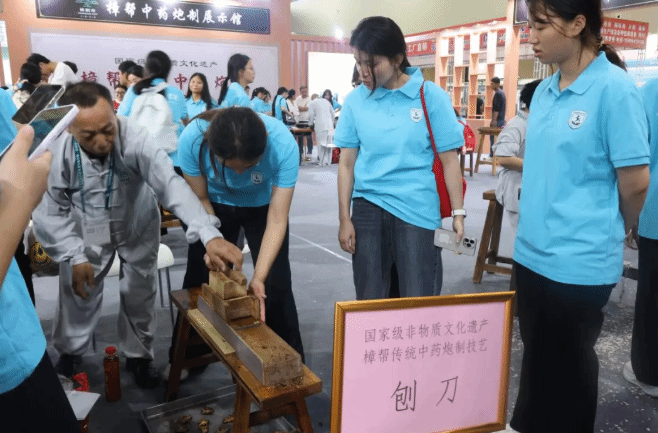 上午10:30,“樟帮”炮制技艺展演区前挤满了学生。展演台铺着干净的白色棉布,台上整齐摆放着铁碾船、铜锅、竹筛等传统炮制工具。“樟帮”技艺传承人一边演示一边讲解。现场还有学生拿出手机拍摄炮制过程,有的则在笔记本上记录工具名称和操作技巧,深入了解“樟帮”33项省级规范技艺的原理与应用。