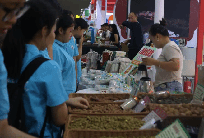 随后进入会展中心,研学首站——医药创新批文转让展正式开启。2万平方米的会场内,12个特色展区依次排开,每个展区门口都摆放着清晰的导览牌,标注着参展企业名称与展示内容。在医药创新批文转让展区,江西某药企的工作人员正拿着产品手册,向学生们讲解一款新研发的中成药批文转让流程。现场还有不少学生围着参展企业的样品展台,仔细观察新型药品的包装设计、成分说明,不时用手机拍摄产品信息,以便后续整理学习。