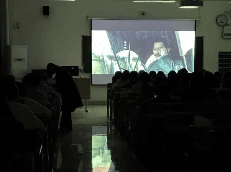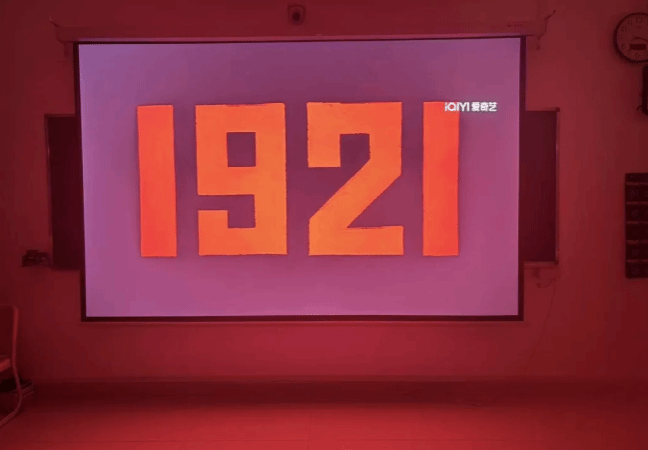 观影当天傍晚,同学们有序入场,原本宽敞的合班教室很快坐得满满当当。随着灯光渐暗,银幕上亮起醒目的“1921”橙红色字样,现场瞬间安静下来——当影片镜头切换到百年前的上海石库门、嘉兴南湖,当革命先辈们在风雨如晦的年代里,为救亡图存奔走呼号、为理想信念挺身而出的画面逐一浮现,同学们的目光紧紧锁定银幕,沉浸式走进那段热血沸腾的岁月。