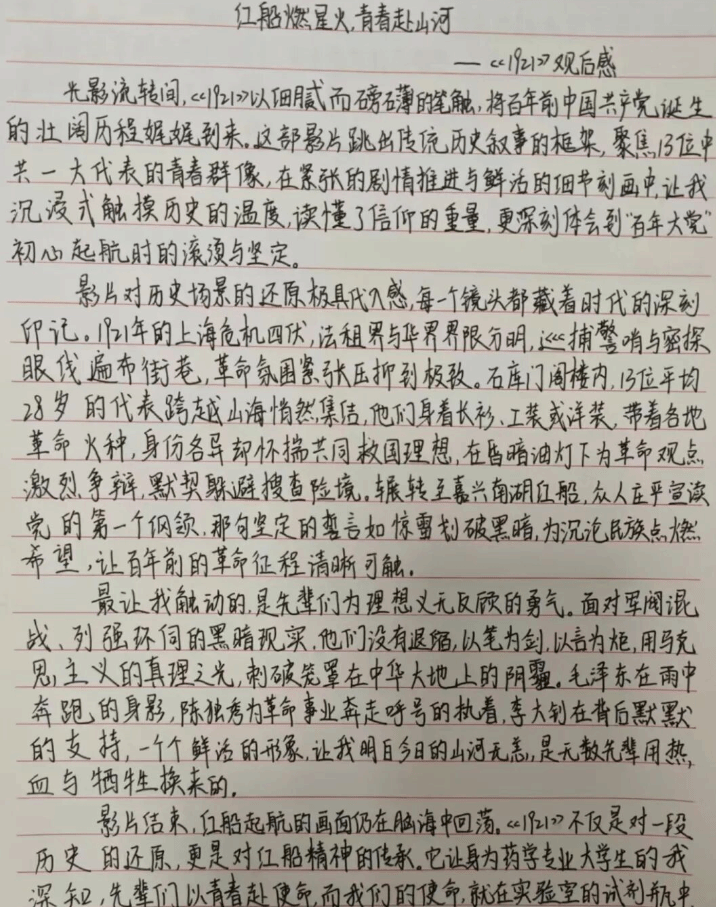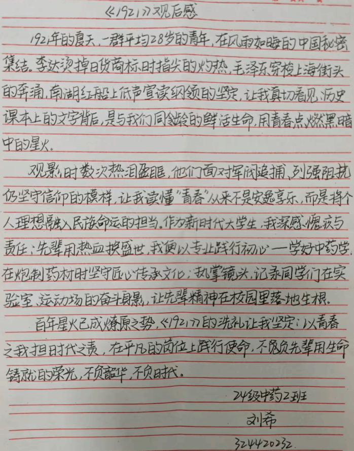 影片落幕、灯光亮起时,现场短暂沉默后响起了自发的掌声。不少同学结合观影感受与历史知识,伏案写下心中所悟:“先辈们以青春赴使命,我们这代青年,该以奋斗担责任”“学好药学的专业知识,也是在为强国事业添砖加瓦”“原来‘初心’不是抽象的词,是先辈们愿意用生命守护的信仰”……也有同学选择将感悟铭记于心,“把感动变成行动,就是最好的传承”。