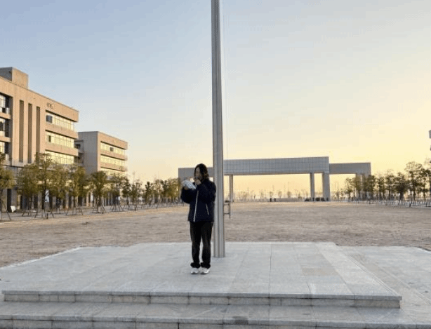 晨光熹微,国旗护卫队队员们身着戎装,步伐铿锵,以昂扬之姿护卫国旗步入广场。随着主持人万嘉仪同学“升国旗,奏唱国歌,行注目礼”的口令响起,激昂的《义勇军进行曲》划破长空。全体师生肃立行注目礼, 目光追随着国旗, 深切缅怀历史, 暗自许下砥砺前行谱写时代华章之愿。
