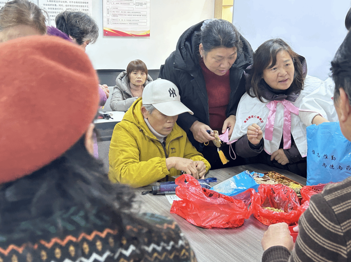 讲座结束后,备受期待的香囊DIY环节将活动推向高潮。志愿者提前准备了、艾叶、石菖蒲、白芷、陈皮、广藿香等具有预防流感、清热解毒功效的中草药材料,并详细介绍了各味药材的特性与配伍知识。在邓素萍和其他志愿者们的耐心指导下,社区老人亲手挑选药材、封装香囊。一个个亲手制作的防流感香囊,不仅实用,更化作关爱与祝福的载体,活动现场药香弥漫,其乐融融。