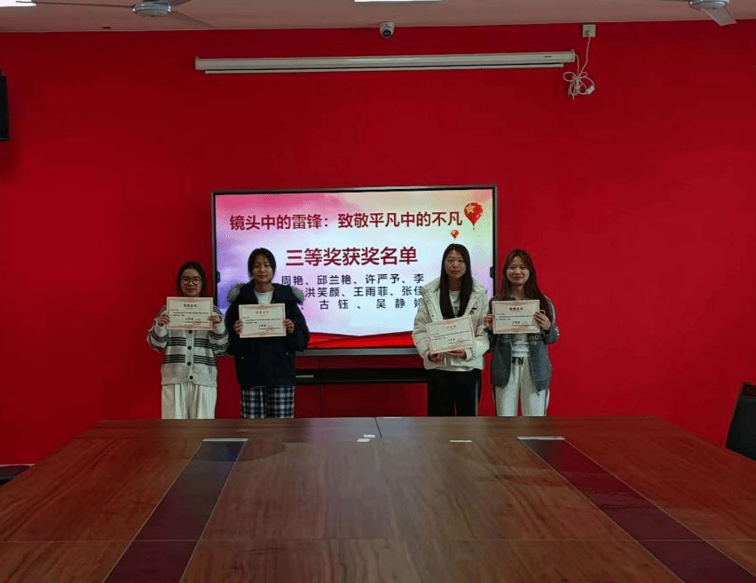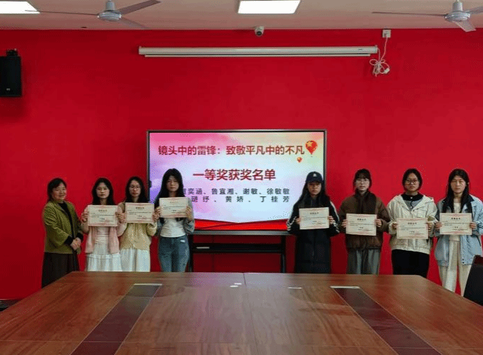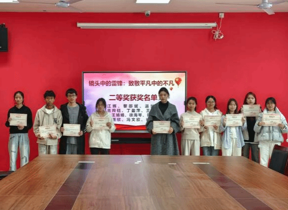 颁奖仪式现场,系党支部书记邓素萍及系部教师为获奖选手颁发荣誉证书,获奖同学手持证书有序合影留念,定格下这份属于青春的荣誉与成长,也定格了雷锋精神传承的鲜活瞬间。