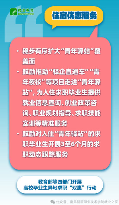 鼓励有条件的地方积极整合社会资源,向入住求职毕业生提供涵盖交通、通讯、文旅、餐饮等方面的优惠举措,减轻异地求职毕业生的经济负担。