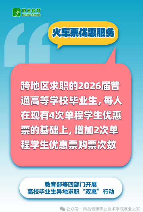 跨地区求职(求职地点不在学校所在地)的2026届普通高等学校毕业生,每人在现有4次单程学生优惠票的基础上,增加2次单程学生优惠票购票次数。