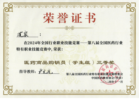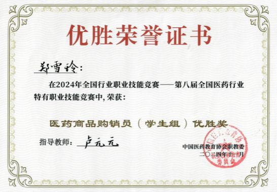 (一) 个人荣誉:医药商品购销员(学生组)三等奖1个、优胜奖1个